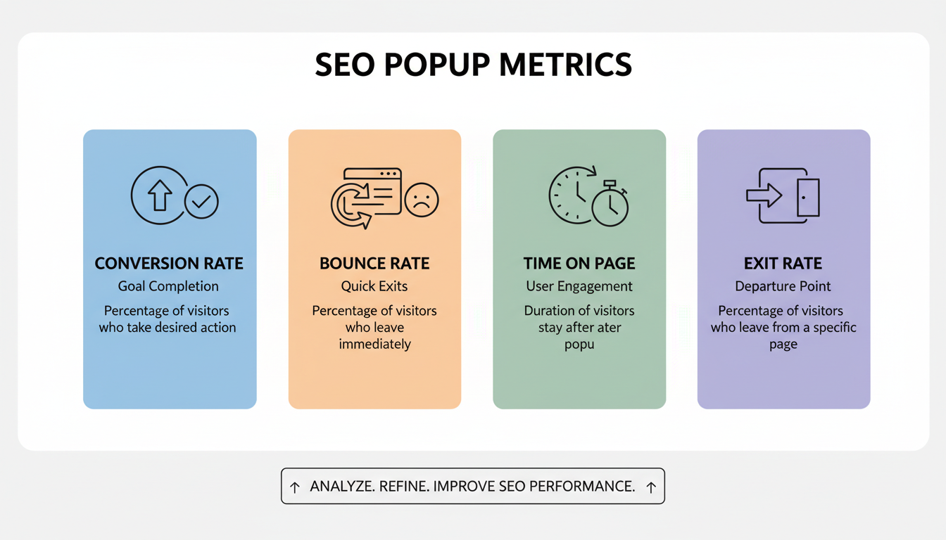 Measure the effectiveness of SEO popups by tracking key metrics such as conversion rate, bounce rate, time on page, and exit rate. Using tools like Google Analytics can provide valuable insights into their performance.