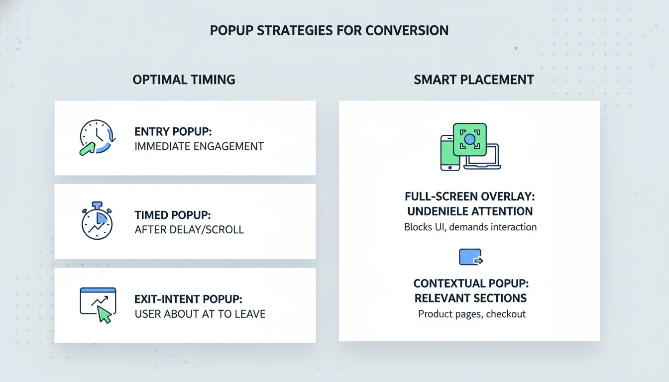 Timing is critical for the success of your popup. Deploy popups at moments when users are most likely to engage. For example, timed popups can appear after a user has spent a certain amount of time on your site, indicating interest. Entry popups should be immediate, while exit-intent popups should trigger just as the user is about to leave.