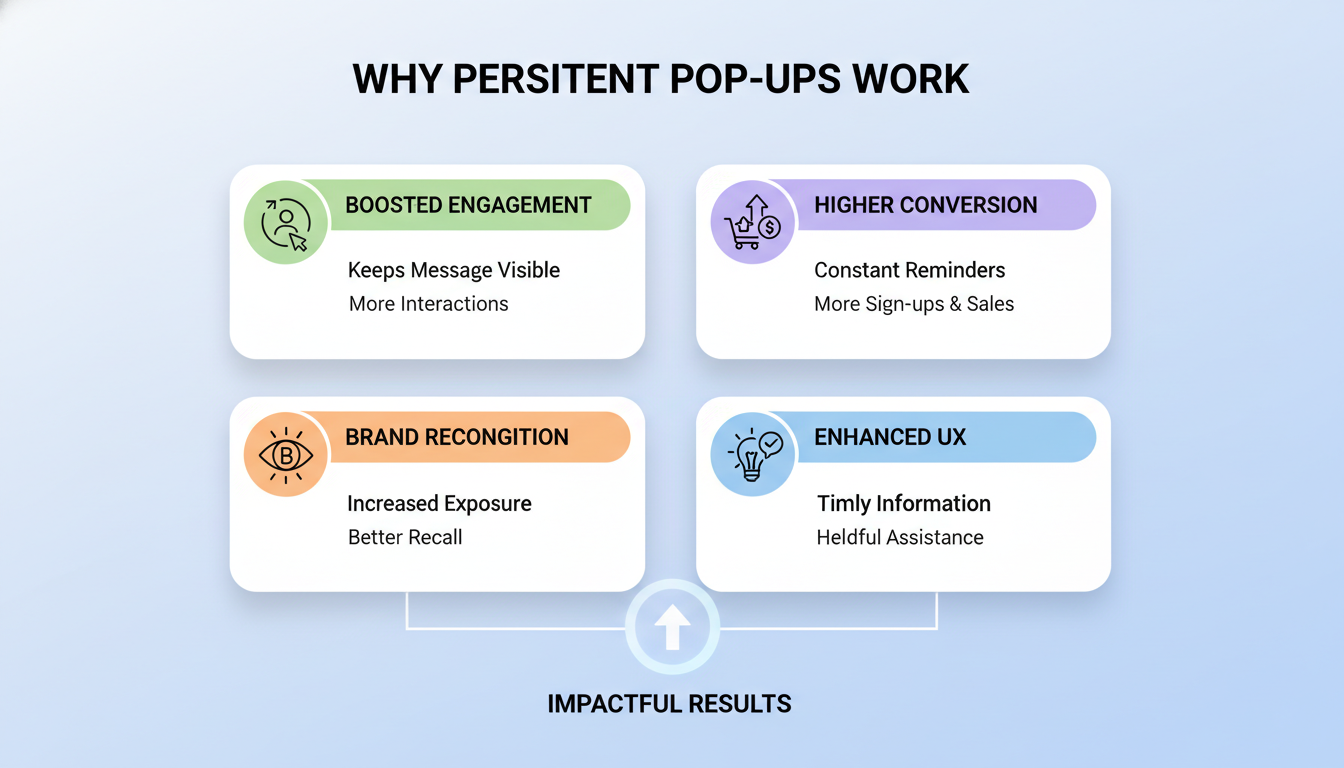 Persistent popups offer several significant advantages that can substantially enhance user interaction and conversion rates on digital platforms:
