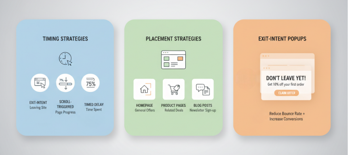 The timing of your popup plays a critical role in its effectiveness. Popups that appear at the right moment are more likely to capture user attention without causing frustration. Consider using: