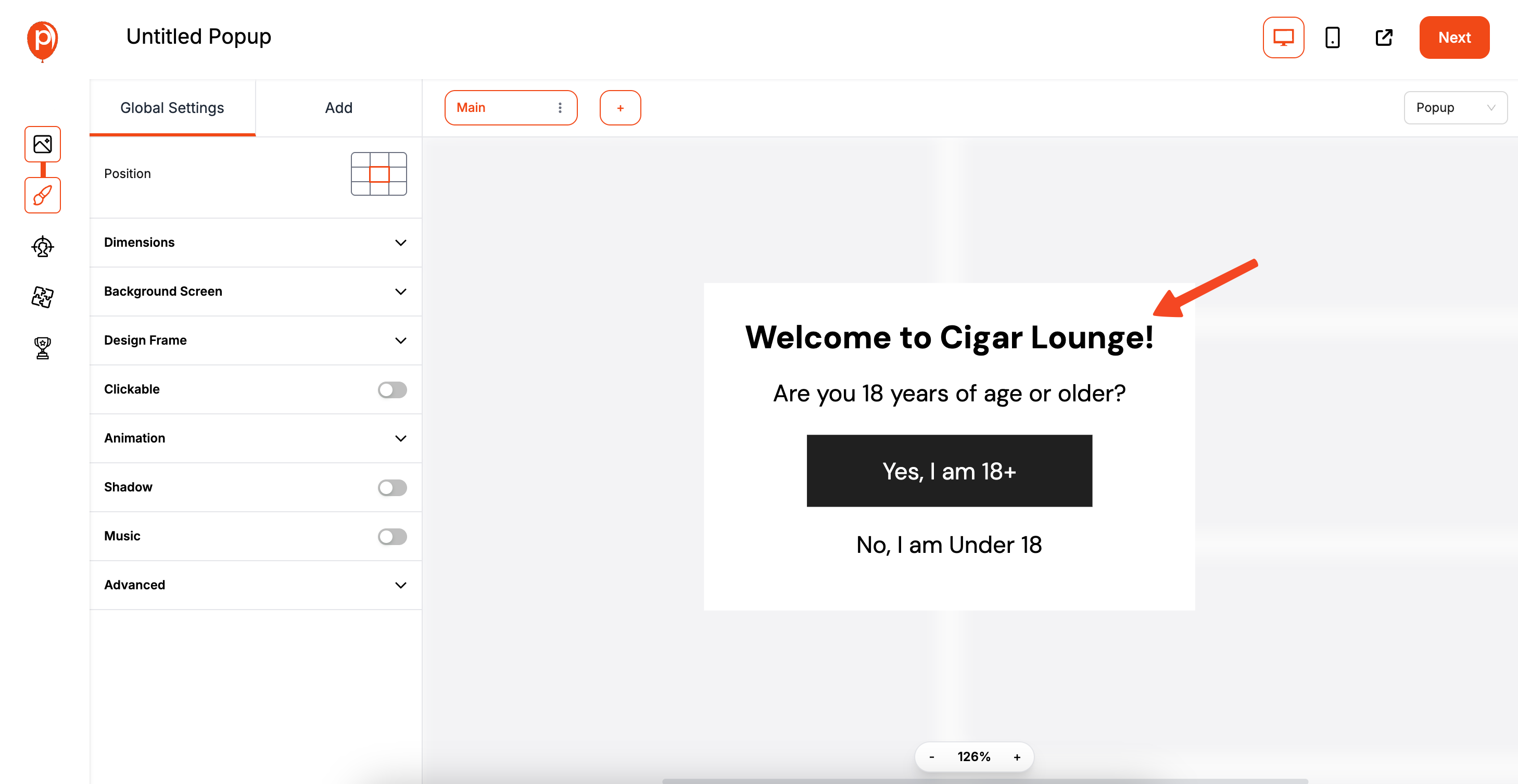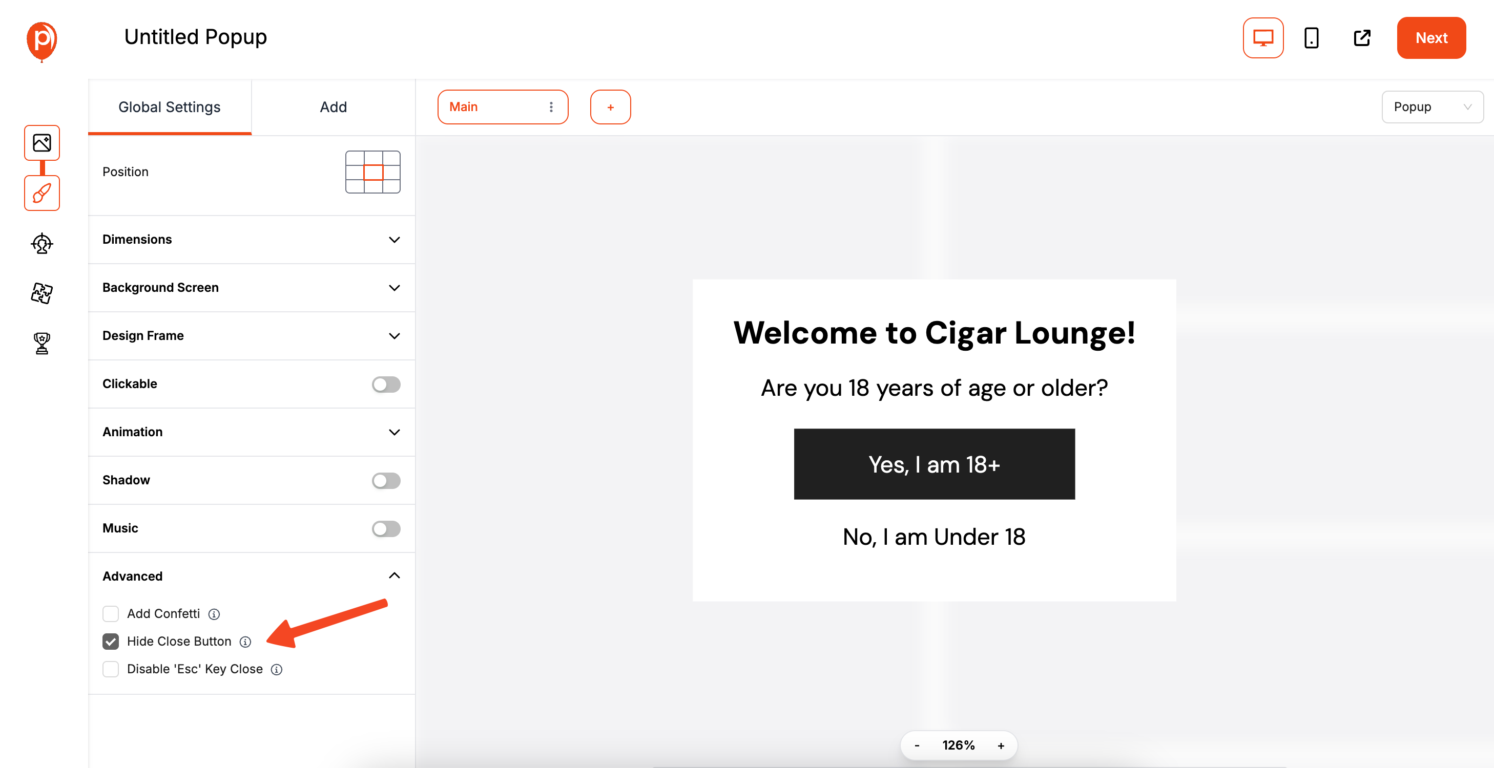 An age gate is useless if a visitor can simply close it. We need to make it mandatory. In the editor, look for Global Settings. You need to ensure that Hide Close Button and Disable Overlay Click Close are both turned on. This removes the 'X' button and prevents users from just clicking outside the popup to dismiss it.