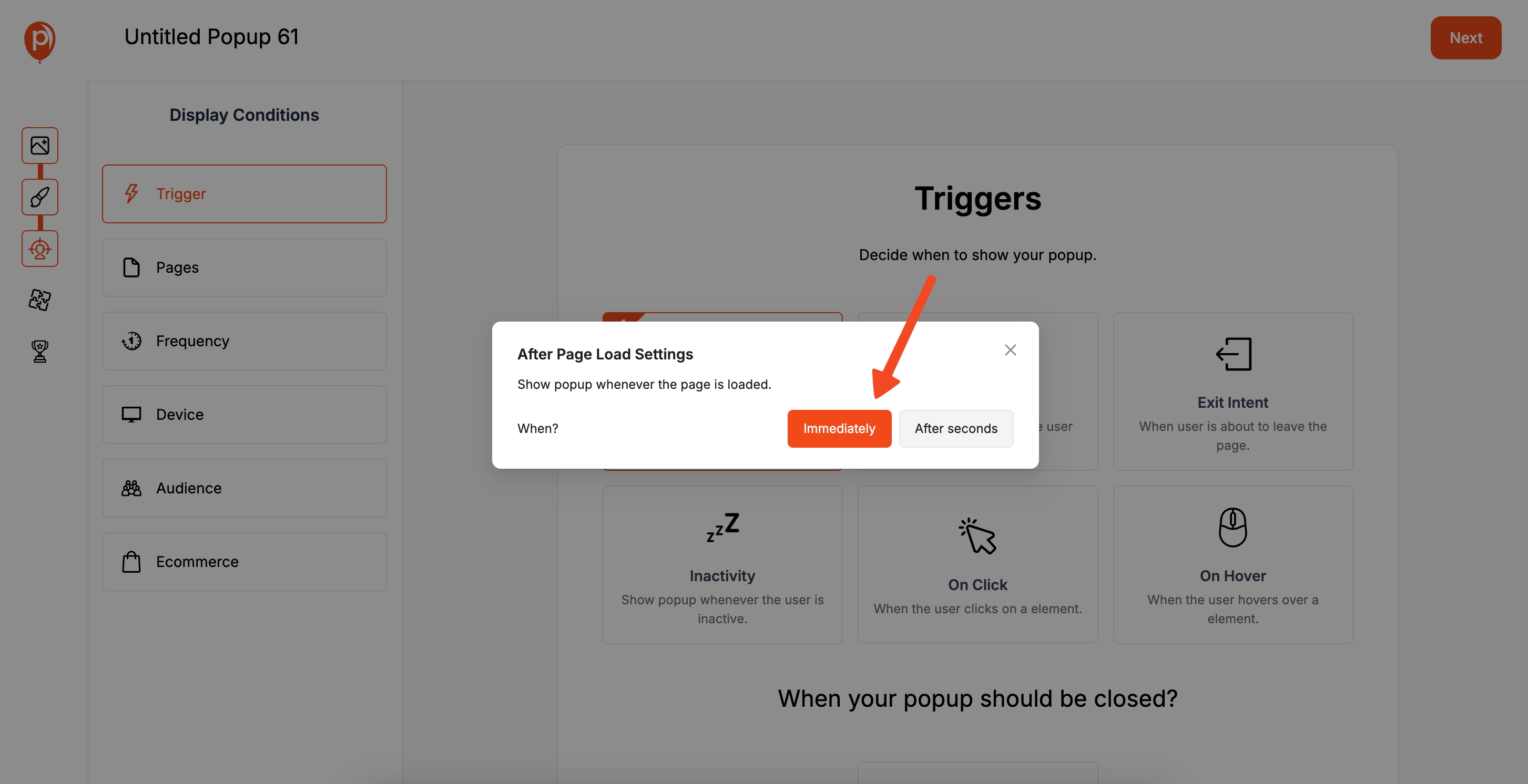 Your age gate must be the very first thing a new visitor sees. To do this, navigate to the Display Conditions page. Under the Triggers section, set the popup to appear after 0 seconds. This ensures it loads immediately with the page, blocking the content behind it until the visitor verifies their age.
