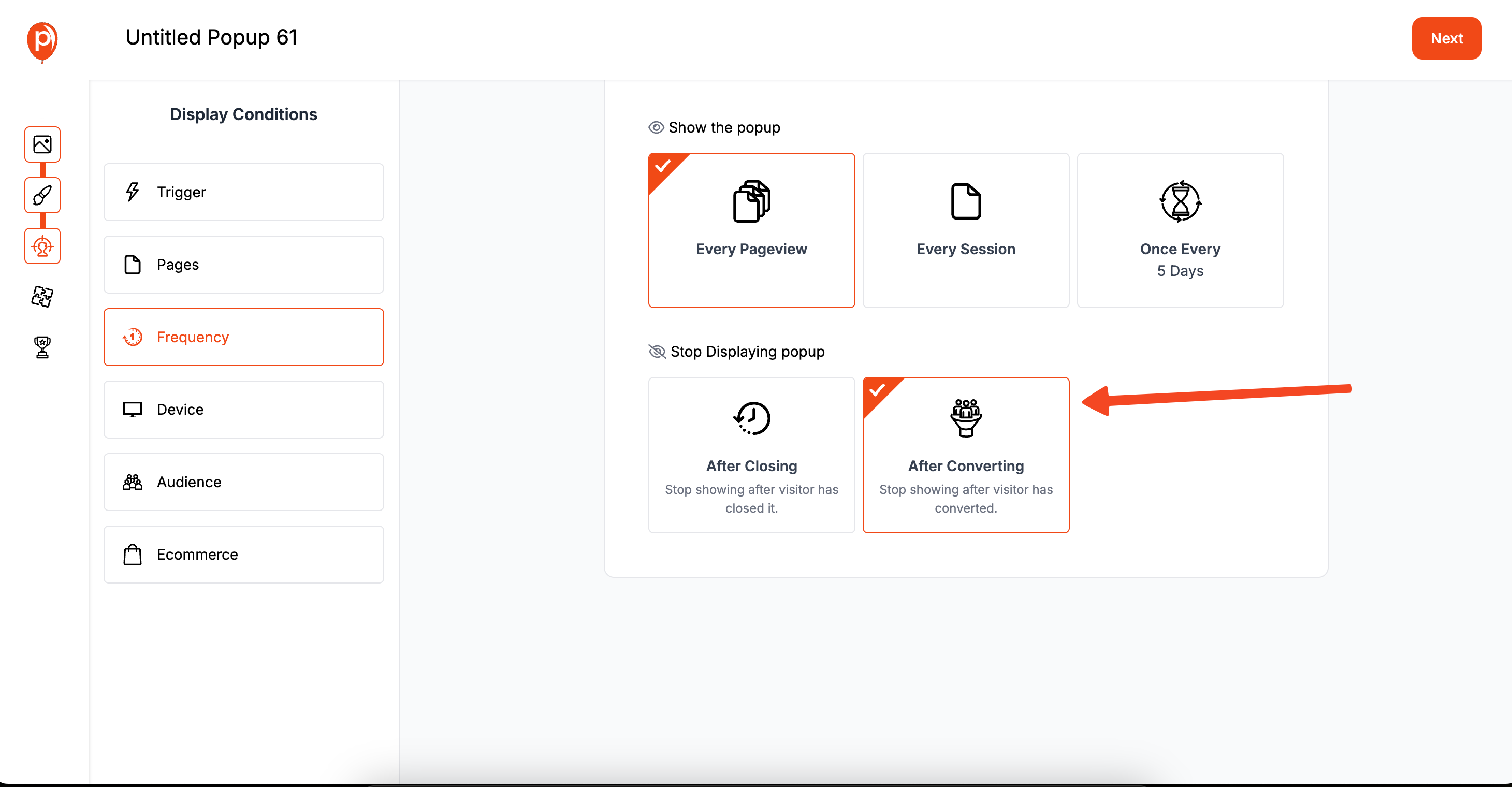 You don’t want to ask for a visitor’s age every time they click to a new page. It creates a terrible user experience. To prevent this, stay on the Display Conditions page and look for the Frequency settings.