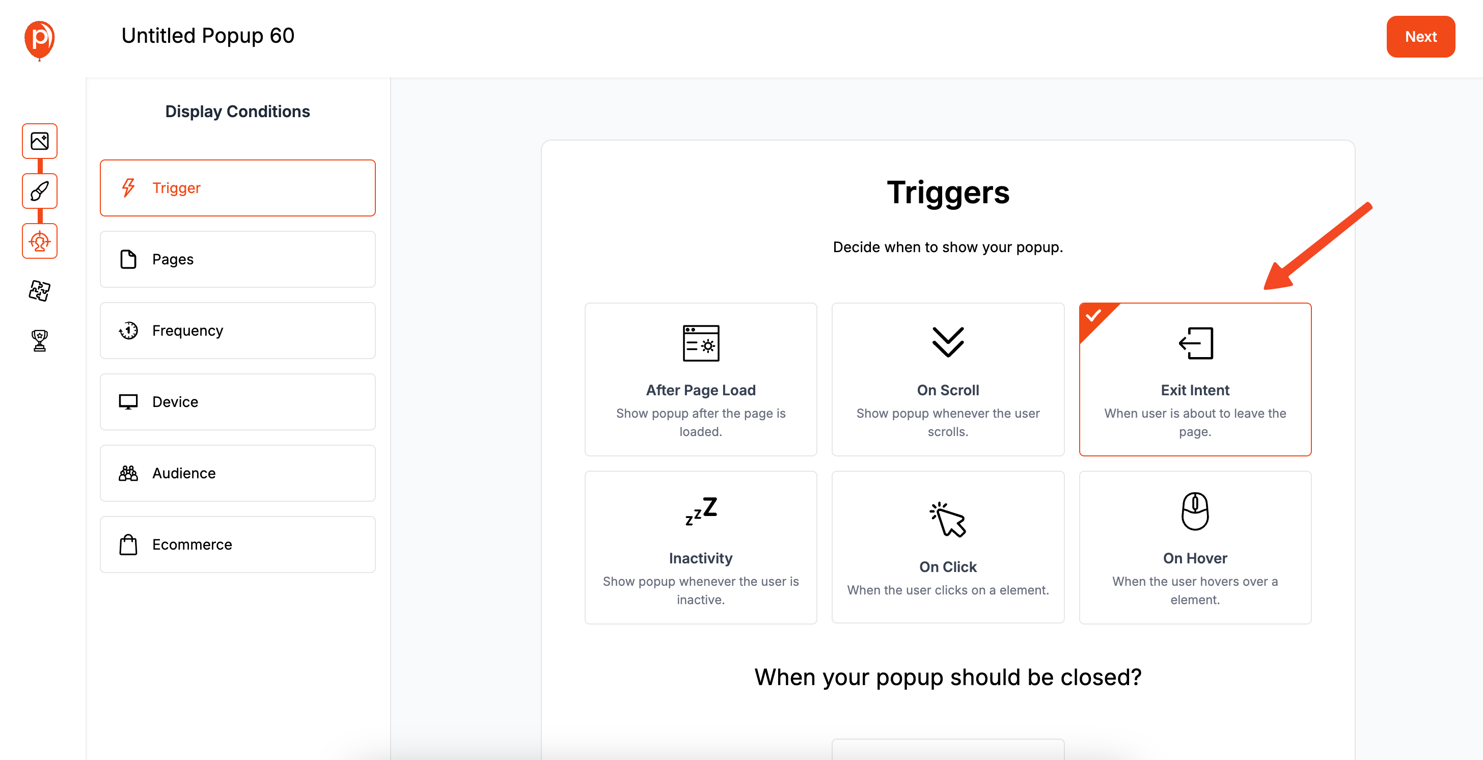 Navigate to the Display Conditions page. This is where you control the logic behind your popup. In the Triggers section, you’ll see an option for Exit-Intent. Simply turn it on.